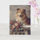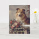 Este nostálgico cartão de Natal apresenta um sorridente cão collie com um buquê de poinsettias. Você pode personalizar a saudação na frente e a mensagem dentro da placa de acordo com o seu gosto.