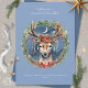 Cartão de Natal de Feriado de inverno, Berries, Berries, com fundo azul empoeirado e costas azuis escuras. Feliz Solstício de inverno! Celebre a mais longa e mágica noite do ano com este belo design de Natal Feriado de inverno Solstício. Este belo design de aquarela moderno apresenta uma coroa verde, cervo com galhos, estrelas douradas e lua azul crescente, galhos, velas vermelhas com chama brilhante e pontos metafísicos de cristal de ouro esotérico. Texto pronto para personalizar com suas informações.