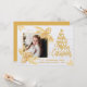 Cartão de Natal de Feriado Rústico Dourado de Pinheiro. Cones de pinheiro ouro e galhos de pinheiro enfeitam este lindo cartão de feriado fotográfico. Uma citação da tipografia da árvore de cristma dourada que diz "Desejamos a vocês um natal alegre" se senta à direita. Um quadro de ouro geométrico rodeia a sua fotografia personalizada. Personalize facilmente este design personalizado com os seus próprios nomes familiares, texto e ano.
