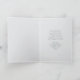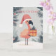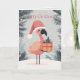 Cartão de Natal com um flamingo fofo segurando um presente de Natal. Você pode personalizar tanto a saudação na frente quanto a mensagem dentro do cartão ao seu gosto.