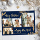 Orçamento, Elegante, Botânico moderno Dourado e Marinho deixa 4 fotos com cartão de Natal feliz. Este modelo de cartão de 4 fotos, festivo, mimalista e cômico, apresenta uma bonito colagem fotográfica, folhas botânicas de folha de ouro falso, winterberry e diz Feliz Natal e Feliz ano novo! O texto de saudação de "Feliz Natal e Feliz ano novo!" é escrito em um belo tipo de letra tipografia escrita à mão sobre fundo azul marinho. No verso, uma fotografia horizontal com a armação de ouro e as folhas de folhosas douradas, dispostas sobre o marinho. Bonito manutenção para sua família e amigos nesta época de Natal e Férias. Cartões de natal baratos.
