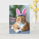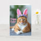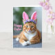 Este cartão mostra um gato malhado ruivo relaxado com listras âmbar e peito e patas brancas, deitado com as pernas dianteiras gentilmente cruzadas como se estivesse posando para um doce retrato de primavera. Suaves orelhas de coelho rosa estão sobre sua cabeça, e uma pequena coroa de minúsculas flores de lavanda adiciona um toque terno e amigável 🐰. Os olhos verdes do gato olham diretamente para frente com um foco calmo e afetuoso, como se estivesse compartilhando um momento tranquilo com alguém próximo. A luz incide suavemente sobre o pelo, realçando a textura lisa e os finos bigodes brancos que se espalham pelo focinho. Atrás do gato, o fundo desfoca em tons borrados de verde folhoso e cinza suave, mantendo a atenção no rosto e nas orelhas. Uma curta saudação de Páscoa aparece sobre a imagem em letras rosa-rosado, posicionada na área superior sem cobrir
