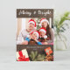Cartão de Natal De Madeira Fotográfica De feliz E Bright Barn. A frente do cartão apresenta um fundo de madeira rústico, dando-lhe uma sensação de quiteiro quente e confortável. A feliz e o Brilho são escritos elegantemente em um script no topo, onde a parte inferior apresenta os presentes lindamente envoltos e as ramificações de pínus de natal. A peça central do cartão é uma foto clássica da família que se estende através do cartão. A foto da família captura um momento alegre, espalhando amor e alegria. A parte de trás do cartão continua o fundo do celeiro criando um sentimento confortável com uma citação sentimental e nomes familiares.