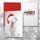 Na frente deste cartão de Natal, um adorável cachorrinho branco com a língua pendurada, veste um chapéu vermelho brilhante de Papai Noel. O dentro tem texto personalizado que diz "Ho Ho" e texto estilizado que diz MERRY CHRISTMAS. Bonita!