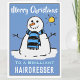 Um desenho animado de boneco de neve em um cartão festivo de Natal. Cartão de Natal para um cabeleireiro.