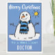 Um desenho animado de boneco de neve em um cartão festivo de Natal. Cartão de Natal para um Doutor.