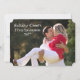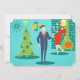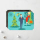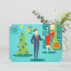 Estes cartões de Natal personalizáveis de Natal "Holiday Cheers" colocarão-vos no espírito de Natal. O design apresenta um fundo turquesa com tijolos lacrimogêneos e uma lareira de cone verde-oliva. Há um relógio de parede lacrimogêneo e uma lâmpada pendente de dois níveis em tons de amarelo, azul e preto. Uma árvore de Natal verde é enfeitada com uma estrela amarela e ornamentos lacrimogêneos. Na frente e no centro, há um distinto empresário martini a nadar num terno azul e gravata laranja. Ao seu lado, sua loira bomba de uma esposa está vestindo um vestido vermelho de bruxa e um chapéu de Papai Noel enquanto segurava uma bandeja de martinis. O lado oposto está pronto para você substituir a foto e a mensagem de modelo por uma de suas. Fa-la-la-di-da! Fotografia © Storytree Studios, Stanford, CA