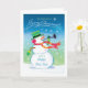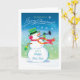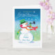 Um boneco de neve está soprando uma trombeta no vento de inverno enquanto seu cachecol também flutua com a corrente de ar neste cartão de férias musical. Flocos de neve estão caindo do título “Nós desejamos a você um Feliz Natal."