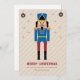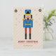 Um cartão de Natal em cores vermelho, marrom e verde com uma ilustração de um Quebra-Nozes, uma bolha e algumas estrelas em um fundo marrom listrado. Você pode usá-lo para o Natal para sua família ou uma empresa, até mesmo para o Ano Novo!