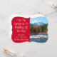 O lado direito do cartão caracteriza sua foto do rio. O lado esquerdo é um fundo vermelho festivo com todo o texto coberto nesta área.