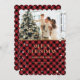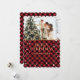 Cartão de Natal personalizado de xadrez de búfalo vermelha e dourada com neve e estrelas em um padrão de xadrez de búfalo. Personalize facilmente este cartão de feriado vermelho e dourado com a sua fotografia e texto. Mais opções de cores disponíveis.
