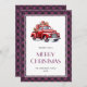 Xadrez de búfalos roxos Cartão de Natal Merry com um caminhão vermelho clássico. Personalize facilmente este cartão de feriado com aquarela com o seu nome de família e o ano.