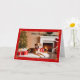 A frente deste cartão de Natal captura uma cena de feriado acolhedora, com um cão feliz deitado num tapete branco liso em frente a uma lareira calorosamente iluminada. O cachorro, adorado com um colar vermelho festivo, parece alegre e tranquilo, trazendo calor e charme ao cartão. Uma bela árvore de Natal decorada fica por perto, enfeitada com luzes e ornamentos de ouro. Caixas de presentes vermelhos com fitas brancas acrescentam ao ambiente de férias, enquanto um estoque de Natal e coroa completam o conforto e tradicional cenário. A saudação de "Feliz Natal" é exibida em uma elegante escrita preta no centro, enquanto uma rica borda vermelha com delicado filigre de ouro nos cantos enquadra a cena, acrescentando um toque de elegância. Este cartão é perfeito para amantes de animais de estimação e para qualquer um que desfruta de um cenário clássico de feriado animador.