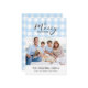 Gingham azul-claro clássico com saudação de Feliz Natal. Espaço para 1 foto horizontal e mensagem pessoal na frente, e o ano no lado traseiro correspondente.