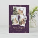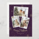 Foto personalizada púrpura e dourada Cartão de Natal Merry com uma colagem fotográfica, uma elegante letra escrita e fundo roxo adornados com neve caindo e flocos de neve. Personalize facilmente este cartão de feriado moderno com as suas fotografias e texto.