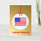 Este cartão de Natal militar apresenta um ornamento de Bandeira dos Estados Unidos na frente com as palavras "A Holiday Obrigado" abaixo do ornamento. Dentro do cartão de saudação são palavras de apreço pelos nossos militares no Natal. Uma bela maneira de enviar cartões de natal e obrigado nossos militares. Copyright Kathy Henis