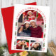 Envie alegria natalina com este cartão de Natal elegante com arco, apresentando três fotos pessoais, sotaques de bastão de doces, folhagens de pinheiro e uma saudação vermelha ousada. Com um design de arco sofisticado e espaço para o nome da sua família e o ano, este cartão é a combinação perfeita de moderno e tradicional.