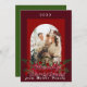 cartão de Natal, cor vermelha cereja e fundo verde natureza com código QR para redes sociais ou site. Adicione sua própria foto da família ou loja. Também pode ser adicionado ao presente.