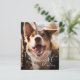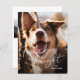 Cartão de Natal com fotos modernas, com um design simples e mínimo com a saudação fofinha "Furry and Bright" em um roteiro elegante sobre uma foto do seu cachorro de estimação. O verso tem uma colagem de fotos com três fotos verticais junto com sua mensagem personalizada em preto e branco.