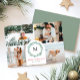Cartões de foto de Natal moderno e mínimo com 4 fotos com sotaque moderno de cor d'água, que enquadra o monograma ou inicial da sua família. O texto diz Feliz Natal em vermelho, que pode ser personalizado para qualquer saudação que você quiser. A parte traseira do cartão contém uma segunda saudação pessoal junto com seus nomes.