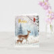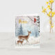 "Uma cena maravilhosa de inverno perfeita para seus cartões de natal. Um pombo gentil e sua proa caminham através de uma floresta nevada, enquanto um cardeal vibrante percorre um galho." Editável