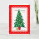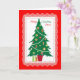 Cartão de Natal para a mãe com uma árvore de Natal decorada e verde e presentes, renda suja como uma borda, num fundo vermelho e branco. Obrigados para a Creative Fabrica para alguns dos elementos na design.