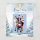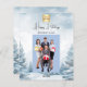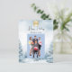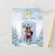 Floresta de inverno moldada como fundo. Personalize e adicione o logotipo, o nome e uma foto da sua empresa. Feliz feriado escrito com um script de estilo manchado de tendências. Voltar: adicione sua mensagem. 1 folha = 1 convite impresso de borda a borda.