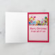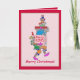 Este cartão personalizado é decorado com um palhaço vestindo um chapéu de Papai Noel equilibrando uma pilha de presentes de Natal.