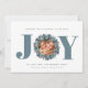 Cartão de Natal para a Tipografia de Foto Eucalyptus moderno - JOY é apresentado em tipografia moderna e em azul com eucalipto e coroa de groselha holly em torno da sua foto favorita. Saudações editáveis diz " Desejando um feriado cheio de JOY." Todo nosso amor, seu nome de família e membros da família. Todo texto é editável. O plano de fundo também pode ser alterado para qualquer cor que você quiser. Desenvolvido por Beverly Bainbridge Magnolia & Thistle