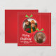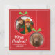 Espalhe alegria natalina com este cartão de Natal personalizável. Com uma ilustração simples de enfeites de Natal amarrados com laços verdes festivos e colocados contra um fundo vermelho brilhante, este cartão oferece espaço para adicionar uma saudação pessoal de Natal, nome da família, uma foto de família preciosa e uma foto do seu cão ou gato de estimação. Perfeito para enviar votos de Natal para familiares, amigos e entes queridos. Crie um cartão de Natal único com este modelo facilmente personalizável.