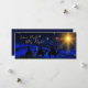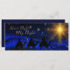 Cartão de Natal Religioso Saudando Bênção Noite Silenciosa Elegante Cartão de Férias Personalizado Noite Santa. Placa plana e/ou placas de natal digitais para download horizontais compridas. O sagrado espiritual e a paz da Santa Noite de Deus é capturado neste moderno e elegante cartão clássico de Natal para você compartilhar com seus entes queridos. Os três sábios em camelos viagem contra um belo fundo azul marinho escuro com a brilhante estrela de Natal dourada de Belém nesta cena extremamente pacífica da história da natividade de Jesus. Uma imagem especial para os cristãos que desejam enviar uma mensagem religiosa tradicional da bênção do Natal. A elegante tipografia moderna proclama "Noite Sagrada Silenciosa". Personalize facilmente os nomes e a mensagem de "bênçãos de Natal para você e seu" nas costas. Opção para alterar todo o texto na frente e atrás. Procure na coleção desta loja etiquetas de endereços, adesivos, decalques de parede (perfeitos para igrejas e outras organizações religiosas), vela, ornamento e outros itens apropriados para dar a ministros, pastores, professores, funcionarios, equipes de trabalho, voluntários, amigos e familiares. Série Inspiração Passo a Passo disponível exclusivamente no Zazzle em zazzle.com/store/KrisHarty, projetada pelo designer internacional Kris Harty. © 2023 Kris Harty Passo a Passo Inspiração Passo a Passo