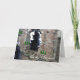 Este cartão apresenta uma parede de tijolos com árvores de Natal iluminadas. Árvores verdes decorativas também. Diz "Feliz Natal".