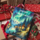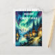 Uma pintura serena retratando uma cabana rústica aninhada entre árvores altas em um cenário florestal tranquilo.