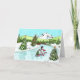 Mande lembranças de Natal felizes! Um boneco de neve em um SUP (Stand-Up Paddleboard) remou pelo rio, cercado por árvores de Natal, com uma ponte vermelha e uma montanha de neve ao fundo.