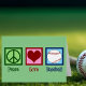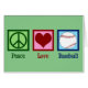 Cartão de beisebol de Amor pela Paz Bonita com um legal sinal de paz, coração e bola para fãs, jogadores ou até mesmo seu pequeno treinador de liga esportiva. Um cartão de Natal de baseball incrível em verde.