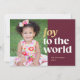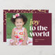 Este cartão de foto festivo de Natal apresenta a frase "Alegria ao mundo" escrita em tipografia dourada e branca contra um fundo rico em granada vermelha. O design de tipografia ousada sobrepõe ligeiramente a foto para um layout único. Personalize com sua foto favorita, seus nomes e o ano de Natal. O verso apresenta confetes dourados festivos contra um fundo de tom de joia vermelha.