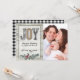 Cartão de Natal rústico em estilo fazenda. O texto na parte inferior é personalizável para sua própria mensagem. Duas opções para o verso com um padrão de madeira shiplap ou xadrez búfalo.