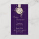 Roxo escuro e de cozinheiro chefe e de negócio da restauração do vintage cartão bege. Este cartão de negócio da restauração é serido para cafés, bistros, cozinheiros chefe, cozinheiros, comensais, e a indústria da comida e da bebida. Caracteriza um quadro do círculo com o chapéu e uma forquilha de um cozinheiro chefe e a faca dentro do quadro. O quadro pendura de uma fita e é decorado pela folha frondosa. O fundo tem listras transparentes claras. Personalize este design de cartão de visita para seu restaurante.