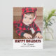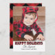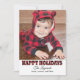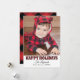 Cartão de foto moderno "Férias Felizes" inclui um grande espaço para foto e texto preto que pode ser personalizado. Apresenta um padrão rústico de xadrez de búfalo vermelho e preto na frente e no verso do cartão com neve falsa.