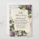 Lindas flores de hortênsia roxa com acabamento em renda. Planejando um casamento? Você precisa de suas amigas para segurar sua mão, ajudá-la a se organizar e fazer você ficar perfeita no seu dia especial. Fazer o pedido é fácil com este cartão de convite para ser minha madrinha. Personalize o cartão alterando o texto nos campos fornecidos na frente e no verso. Você pode alterar o estilo da fonte, tamanho e cor, bem como o tipo e estilo de papel.
