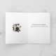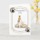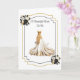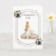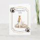 Este cartão de noivado é apresentado com uma impressão artística de um belo vestido de noiva.