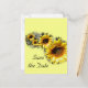 Anuncie sua cerimônia de casamento de verão ou outono e recepção com o bonito Cartão de Noivado de Girassóis Casamento. Este cartão personalizado de data de casamento botânico natural apresenta uma fotografia floral pintada digitalmente de girassóis de jardim florescendo em um fundo amarelo.