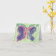 Notecard vazio com uma aguarela de uma borboleta nos roxos, um azul e uma turquesa bonitos, mergulhados na parte dianteira dianteira. Arte por Maeve & por Charlotte.