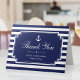 Personalize este cartão de nota de agradecimento de casamento ou chá de panela de noiva personalizado náutico moderno e elegante. Design horizontal listrado branco e azul com elementos brancos e âncora, definido como um modelo para uma personalização fácil. Não se esqueça de alterar ou excluir o texto interno. Itens correspondentes podem ser encontrados na Coleção de Casamento Náutica Azul Crisp.