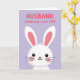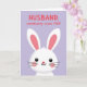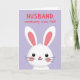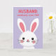 Este cartão apresenta um gráfico simples de um coelho branco amigável perto da parte inferior da frente, olhando para cima com um olhar carinhoso e "pensando em você" 🐰. Duas orelhas extra-longas se estendem para cima, com detalhes internos rosa suave que adicionam um toque gentil e romântico. O rosto do coelho é minimalista e fofo, com olhos pretos pequenos, um nariz vermelho minúsculo, uma boca ligeiramente curva, bochechas rosa suave e algumas cerdas finas. Atrás dele, um fundo lavanda liso mantém a cena calma e terna, deixando a figura branca se destacar claramente. Perto do topo, uma curta mensagem em estilo trocadilho está centralizada em texto vermelho brilhante, fácil de localizar contra o fundo roxo. O espaçamento deixa uma grande área aberta entre o texto e o coelho, dando ao design um ritmo relaxado e doce. Pequenos acentos rosa e aquele nariz vermelho criam um sutil sentimento de "bilhete de amor" sem precisar de decoração extra
