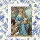 O cartão de nota da Madonna Azul Francesa apresenta uma imagem de um belo cartão sagrado francês antigo impresso no final do século XIX. Jesus e a Mãe Abençoada estão cercados por pombas brancas e uma paisagem arborizada nebulosa.