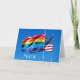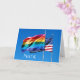 Um cartão de nota brilhante com uma bandeira do Orgulho Arco-Íris, junto com uma bandeira americana, contra um brilhante céu azul. Celebrando uma América acolhedora e diversificada. Fotografado em Cherry Grove na Ilha Fire. Parte da Coleção do Orgulho.