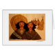 Um índio e uma mulher vestindo brilhantes tons e o sol ouro brilhante no fundo e cinco Tepees.