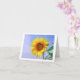 Este cartão postal floral encantador mostra uma imagem de um girassol amarelo vibrante realçado sobre um fundo azul-claro.