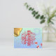 Frente: a placa tem um fundo azul claro. No centro, há um grande texto vermelho que lê "Parabéns para você", decorado com estrelas brancas e vermelhas. Acima do texto, há dois fogos de artifício brancos, e espalhados ao redor estão estrelas pequenas. À direita, há duas caixas-presentes com fitas vermelhas, e no canto inferior esquerdo, há um balão em forma de ouro. Back: Há uma caixa de presentes e ursos de pelúcia falsamente impressos, juntamente com as frases "desejamos o melhor" e "faça um desejo e comemore seu dia especial" em uma fonte elegante.